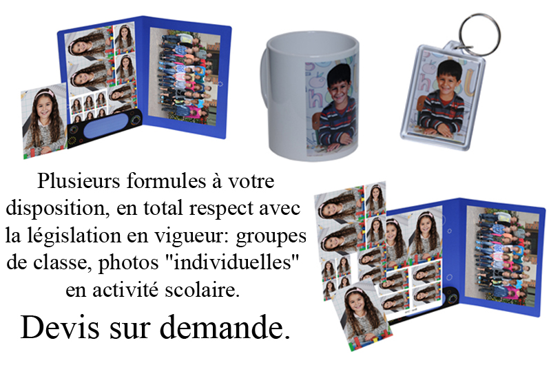 Plusieurs formules à votre disposition, en total respect avec la législation en vigueur: groupes de classe, photos "individuelles" en activité scolaire. Devis sur demande.